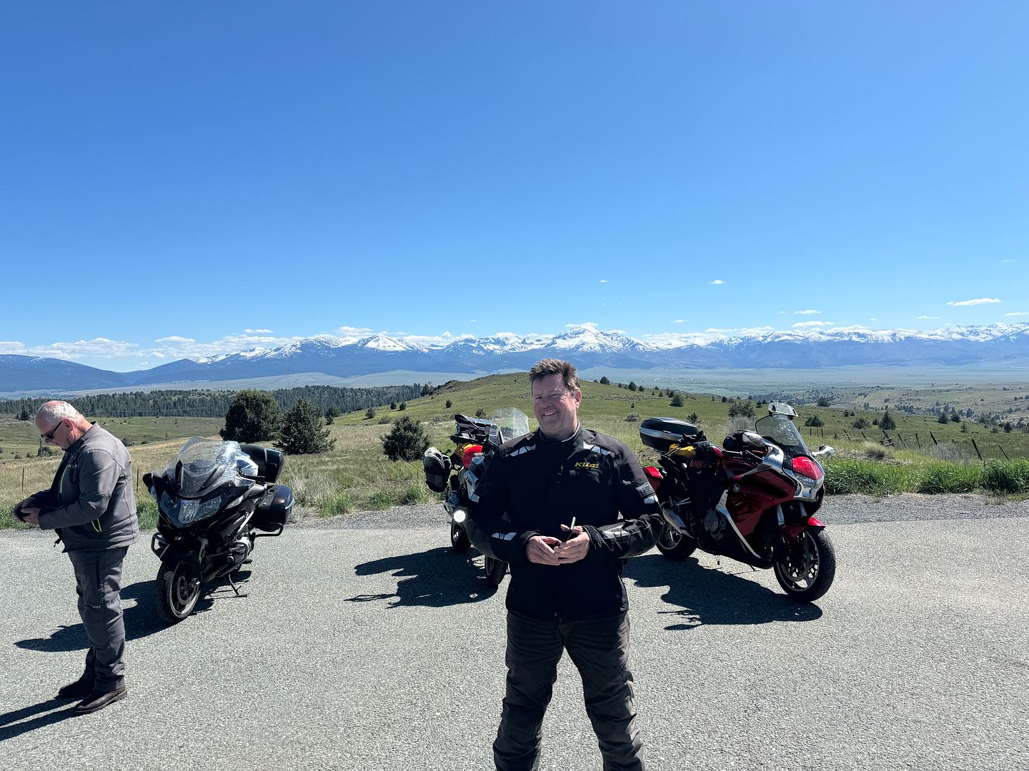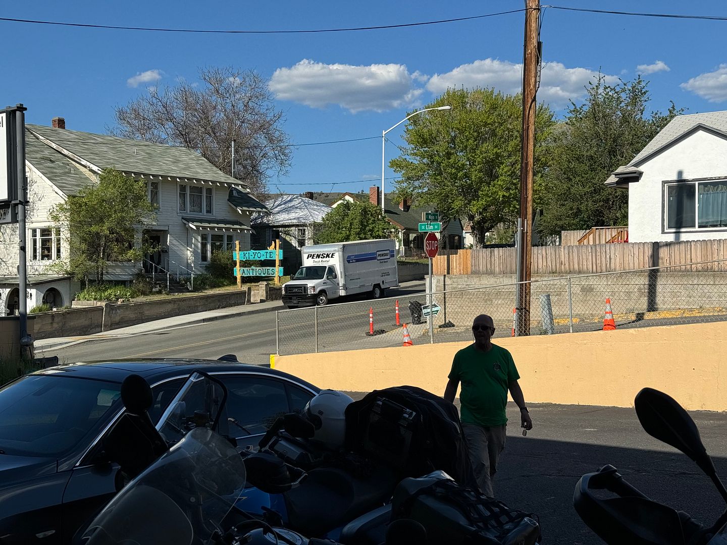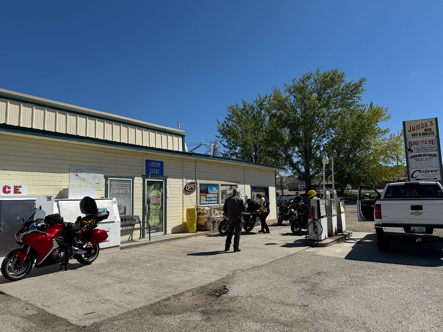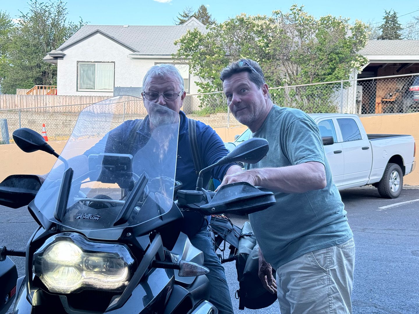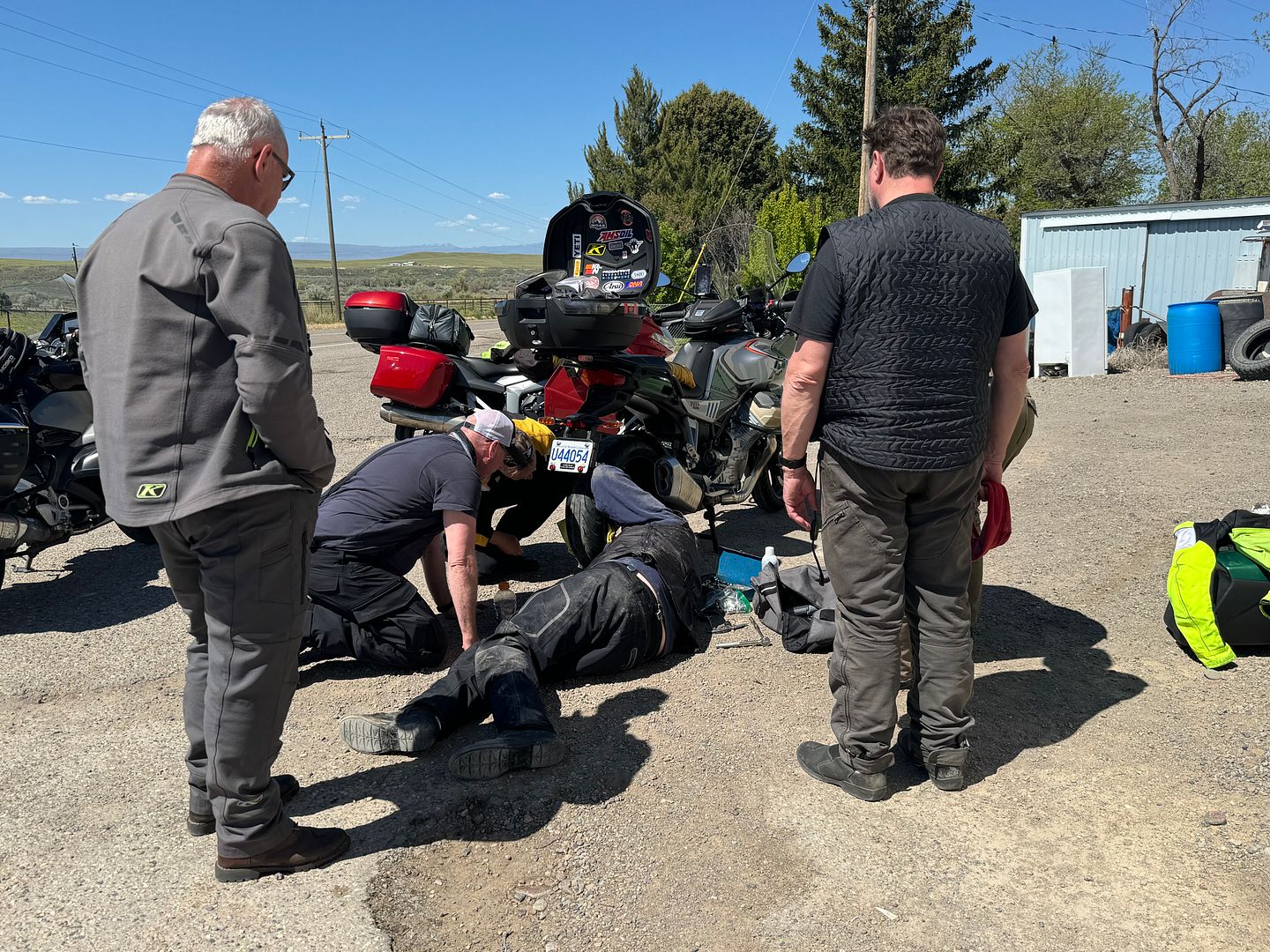 My buddy on the brand new Moto Guzzi ....I noticed his rear tire was soaking wet and I could smell the gear oil....final drive leak....we added more oil...but it was leaking pretty good....after trying some shops on the phone we found out that there was a Penske rental place only 20 min away....lucky! So Cornell rode his bike there...slowly while two buddies followed...they got a truck and loaded it in the back and Cornell met us in John Day...actually he got there before us....this could have been far worse.