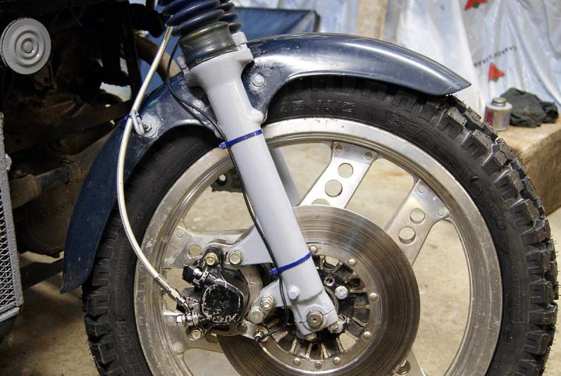 By mid October the new disc was bolted to the wheel, the new tire was on and I was ready to start putting it back together but when I disassembled the old brake system so that I could connect the GS caliper and the new master cylinder (the old one's bore wasn't suitable for this caliper) to my 23 year old stainless braided line I discovered that the braid had been damaged by rubbing where it was zip tied to the eye bolt on the fender (I zip tied the new line to the eye bolt loosely so hopefully between that and the new line's plastic sheath that won't happen again).