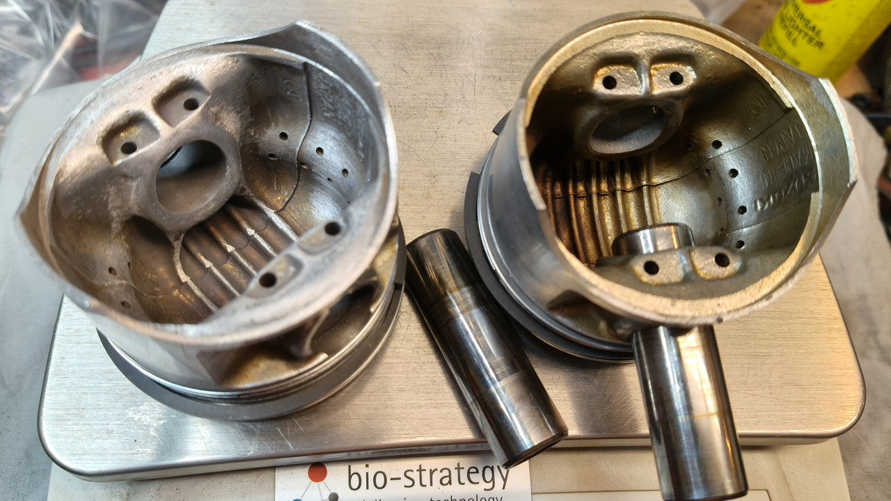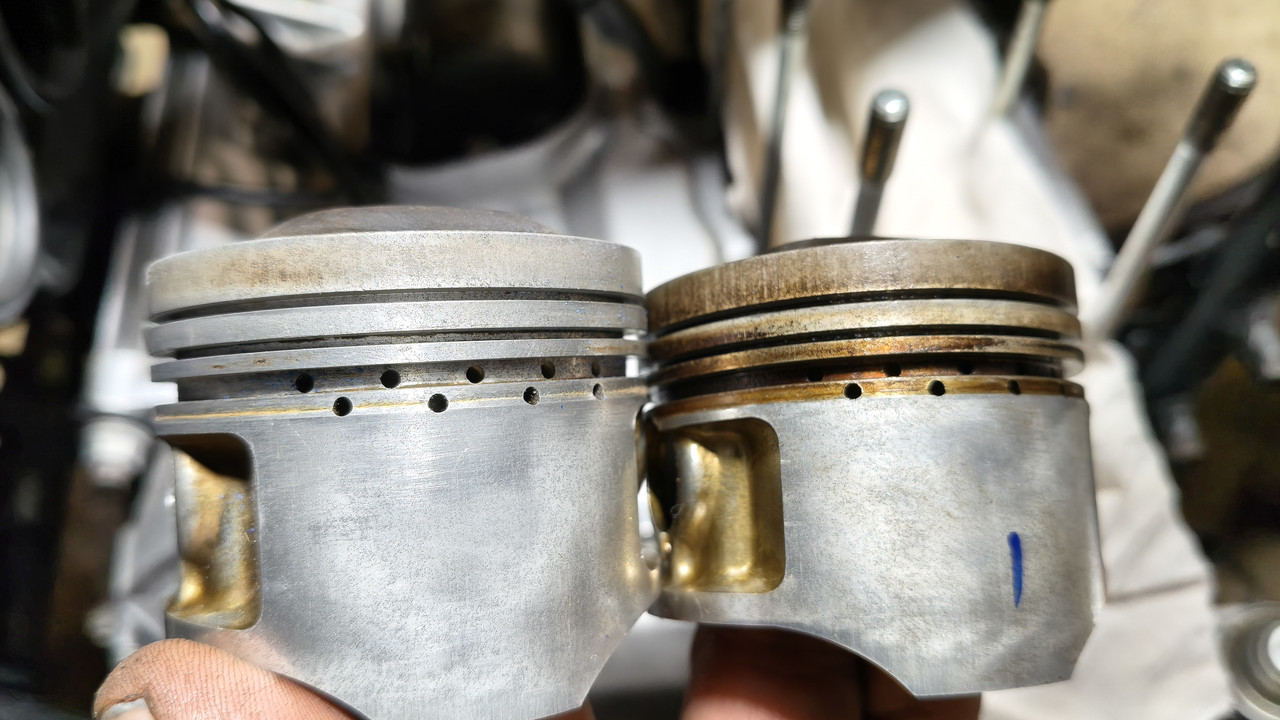 Cleaned the pistons. The ring grooves were full of poo, and the oil control rings were well and truly glued in by oil residue