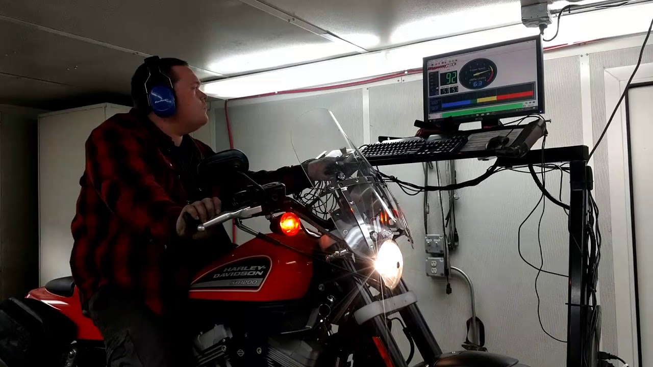 Went for about 200 miles today. The boys at Wilkins Harley put brand new Road-smart 3's, oil in the Engine, Primary and then swapped out the fluids & pads in the brakes. Then they hooked my "little" XR1200 up to this contraption...