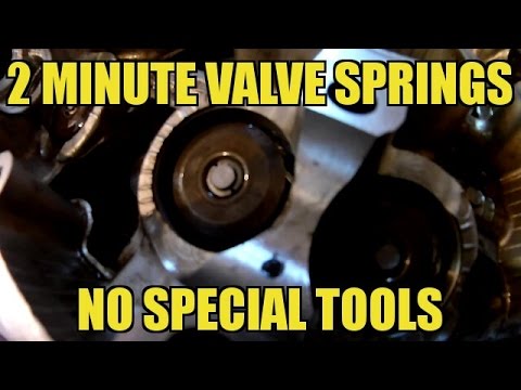 As far as changing the seals with the head on. Theoretically it could be done by placing each cylinder(one at a time) at TDC and either pressurize it with air with a leakdown tester hose screwed in the spark plug hole as long as the rings and valves seal up well or fill the cylinder with oil and screw a spark plug back in to keep the oil in the combustion chamber. Either way should hold the valves in their seats, but the oil would be better in my opinion since the fluid would be hard to compress. It will make a bit of a mess when you turn over the engine to squirt out the excess fluid when your done and it will smoke quite a bit for a few minutes when you done.