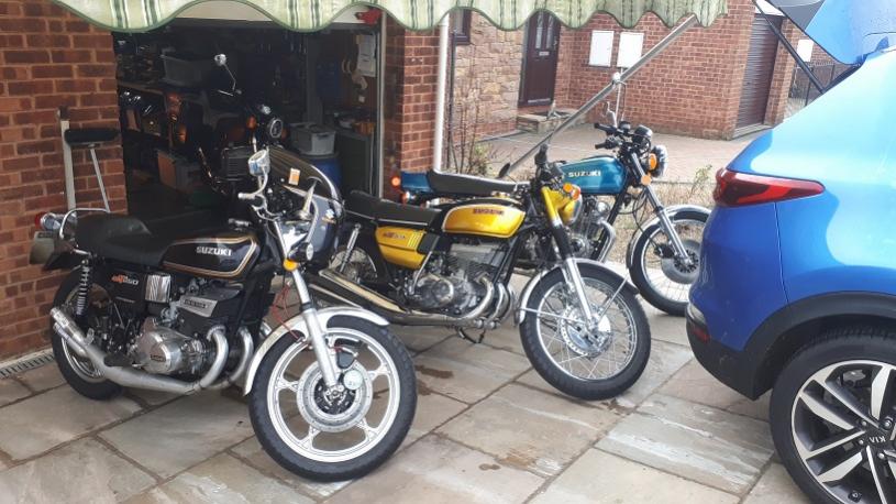 My bikes are predominately 2 stroke triples (Suzukis) both air & water cooled and usually restored by me.