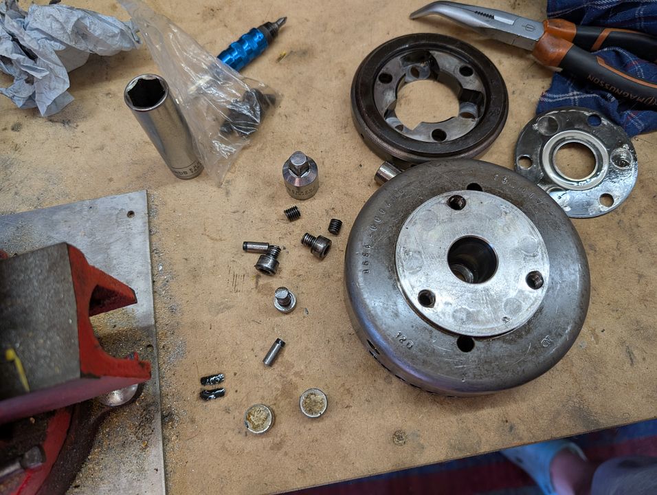 2 of the 3 bolts had broken that hold the starter clutch to the flywheel and to be fair it could have been a lot worse. This is not the 1st time I have damaged and replaced the 3 bolts and I know it is one of the foibles with our bikes.