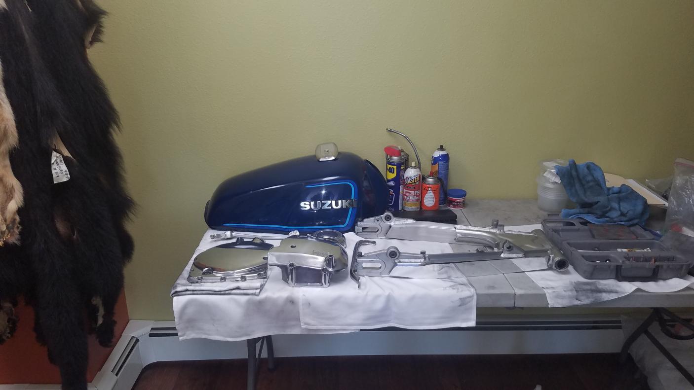 I have just done aluminum clutch side cover, ignition cover, fork bottoms, swingarm, rear peg mounts, both rims, counter sprocket cover and handlebar top clamp plate. Just the flywheel cover to do for the aluminum bits. Also removed and polished alot of chrome bits back to shine from the surface rust look it started at.