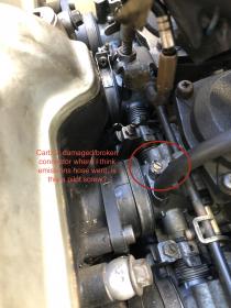 I have a picture of where I think they used to go, and my carbs are physically damaged at the connection point (see pic). Also there are brass screws in that location which I can find no specific reference to in the manual, although they look to be the pilot screws for the low-side carb system, but I can't find any information on how those should be set, if in fact they are the pilot screws.