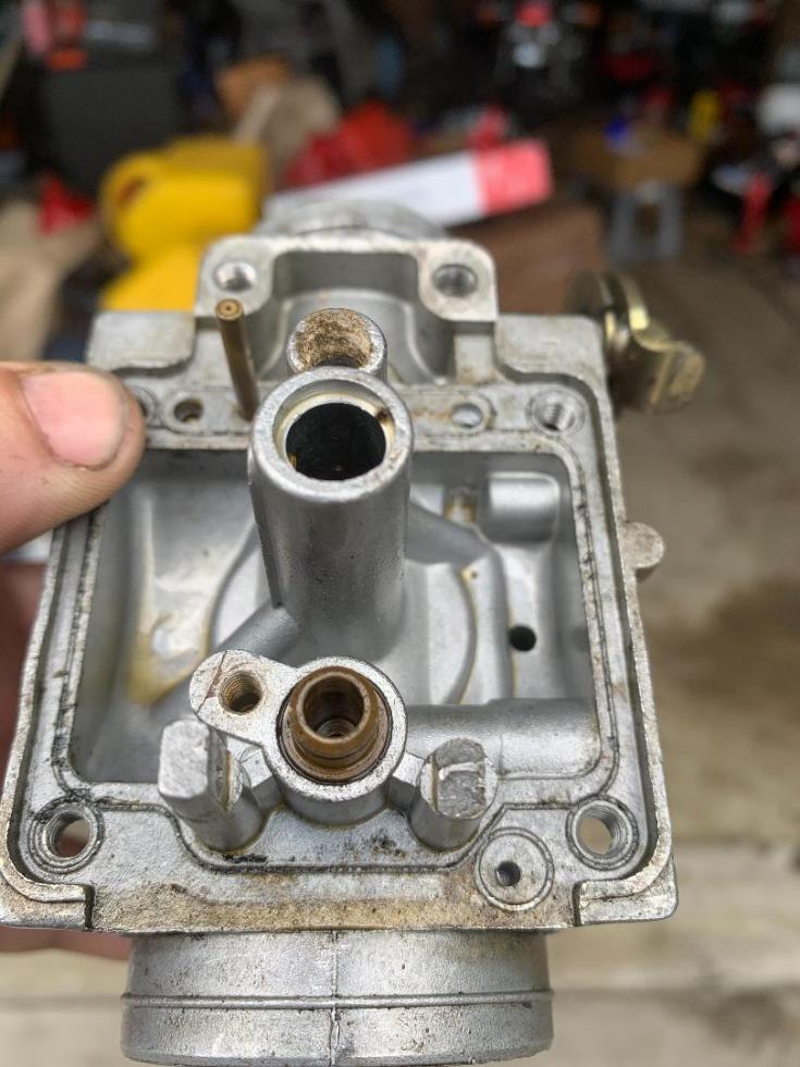 the whole post is gone. the pin is there, but its bent up a little, which im guessing was causing the float to stick and flood the carb.