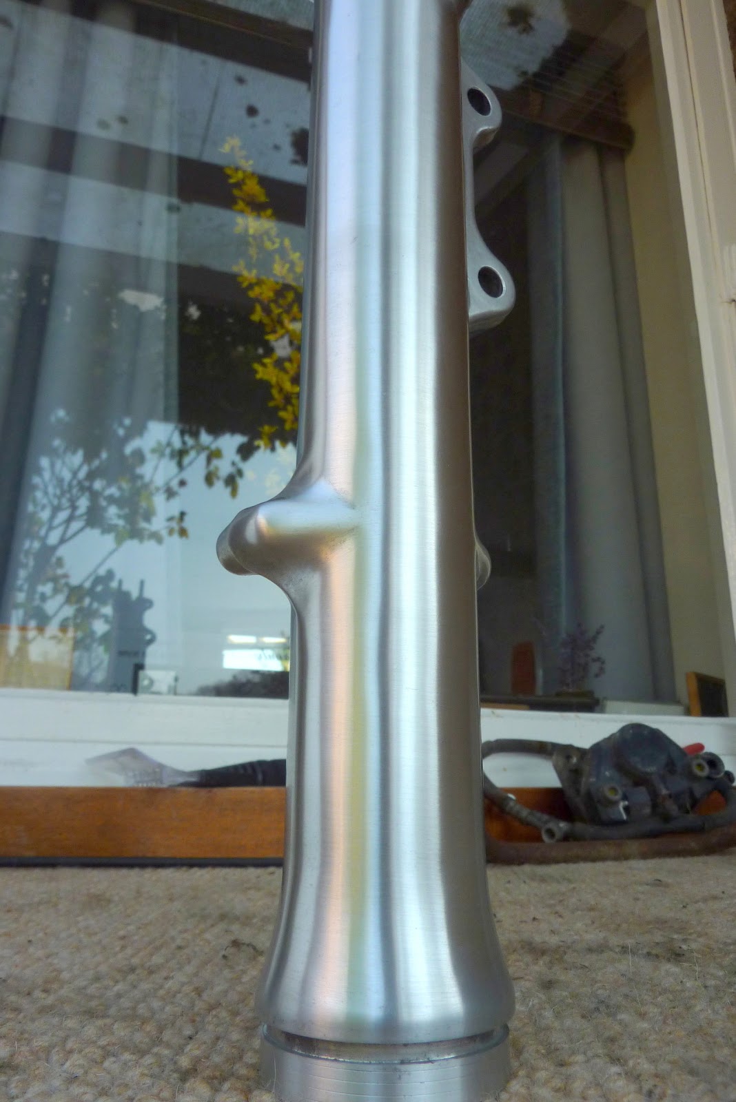 A couple of decades ago I stripped my fork legs and engine cases, made note of the factory sanding marks, cleaned up the corrosion using aluminum jelly, sandpaper and steel wool. Then after making sure they were CLEAN they were clear coated using Glasrit, the paint still looks wet and is just about bullet proof and replicates the original finish.