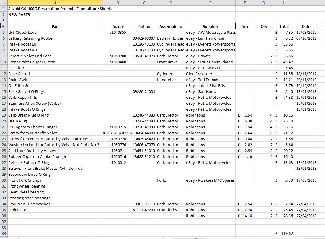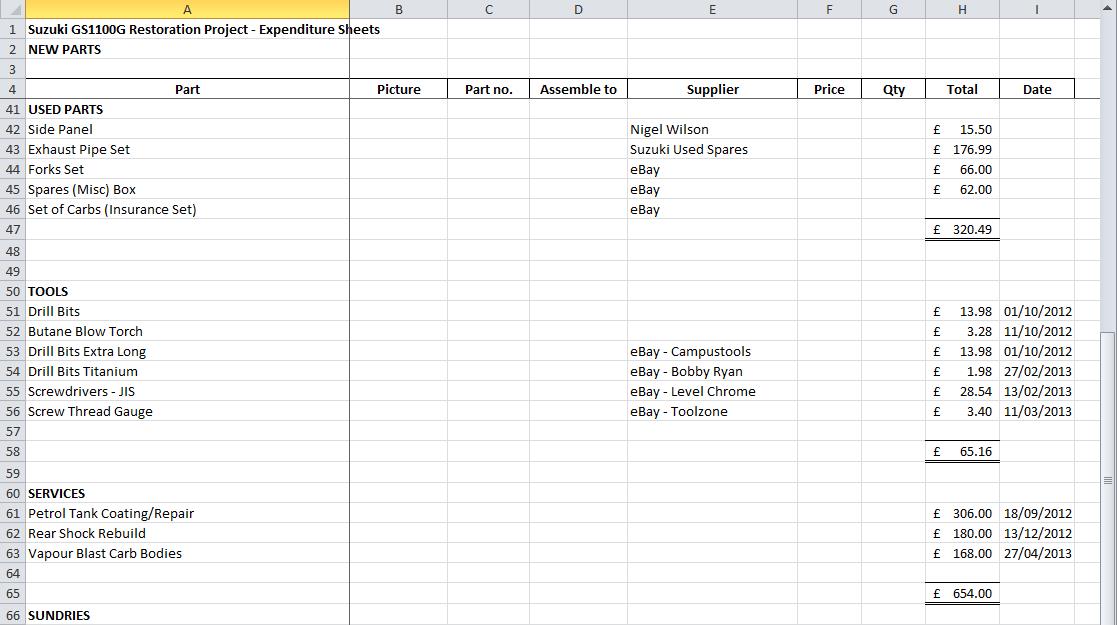 So here are the costs so far. Didn't pay for the bike because it was my Dad's and he left it to me. Costs that I incurred before I started work on it last August would have included shipping from Canada and getting it moved between 3 houses until it arrived here (all this was over a 15 year period). Now that I have started the refurb, this is what I have spent so far: