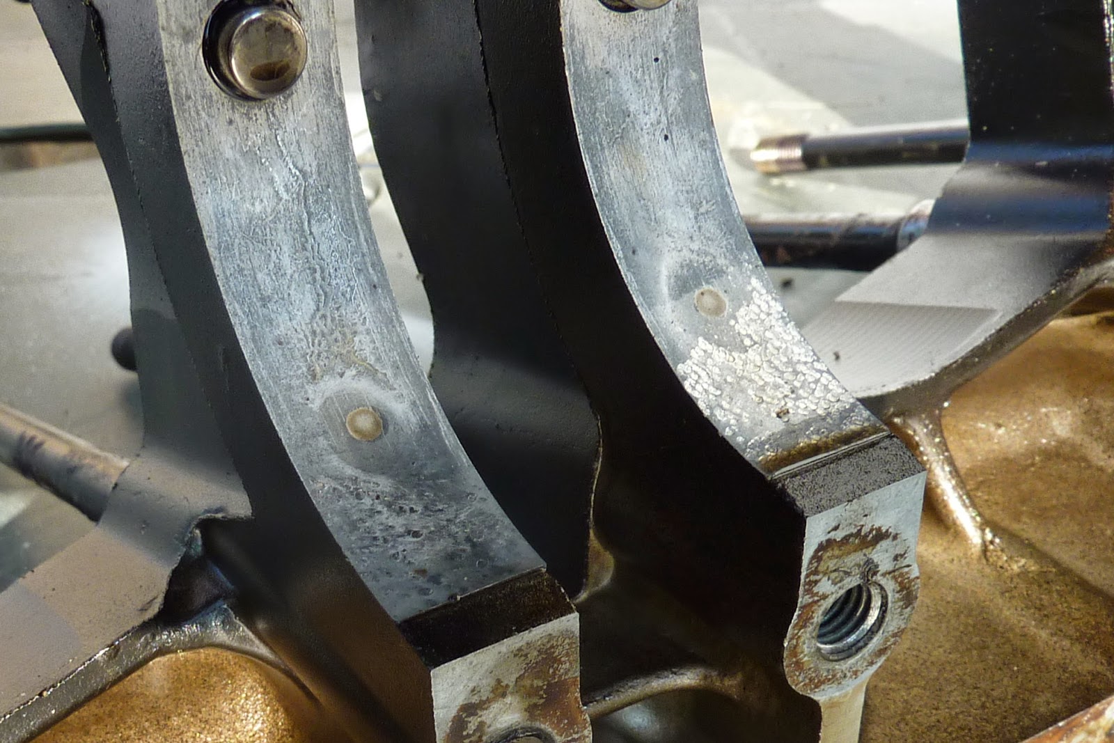 Originally posted by londonboards View PostI'm also thinking of getting some APE crankcase bolts. These cases already have APE cylinder studs but I noticed when I took it apart that the journals that hold the bearings had strange markings on them. I looked it up and it seems that this type of marking on the bearing holders is indicative of movement of the bearing in the holder. Jumping up and down causes it. See the pitting on the right hand side one near the bottom. The standard bolts can stretch and so some high tensile substitutes should put paid to that.