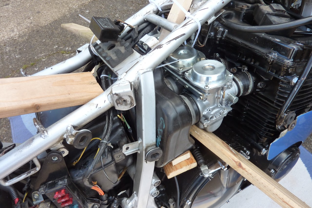 The carbs were in place and the air box was ready. Now I just needed to push the carbs into the engine boots and get the air box boots on the carbs. Well the engine boots were pretty hard and the weather was cold. So even warming them up in the house had little effect. This was a tough job. Firstly I propped them up with some timber and strung them up with some cable ties. The idea being to align them to the engine boots so they could be pressed home.