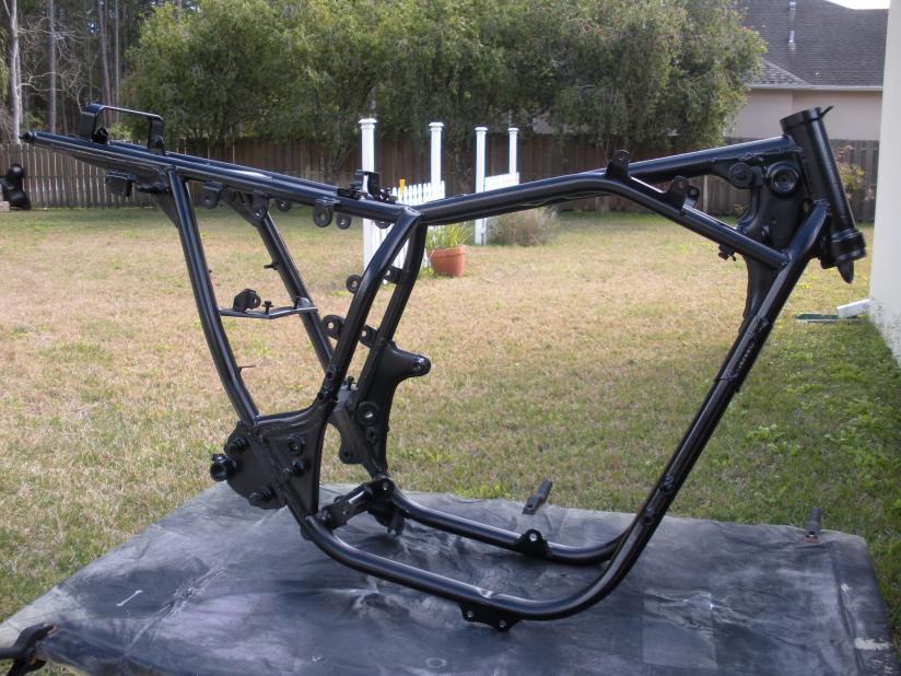 Currently in the process of replacing all of the frame and wheel bearings, beginning with the swing arm. The left hand needle bearing in the swing arm was completely gone and for that alone I'm glad I tore the bike down rather than get it running initially. Here's a pic of the swing arm after bead blast, paint and new bearings installed.