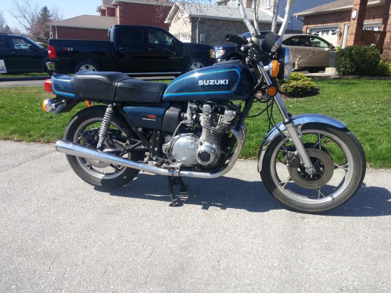 I picked up this 78 GS750 Last week for 5 bills, overall its in great shape, it does have 90'000km on it but I was able to fire it up for the first time today (started on two kicks). I got a ton of spare parts for it, the previous owner was a mechanic and looks like he bought two of nearly everything. I got 4 new pistons and rings, entire engine gasket kit and oil, new valve guides, spare cylinder head, vm26 carbs, gastank, brake rotor etc etc. The bike does smoke quite a lot, guessing bad valve seals or after 90'000km the cylinders are worn.